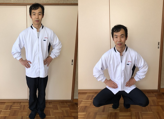 この立ち座りで膝が痛い方は、痛みがない角度まで腰を落とす程度で構いません。それでも筋力は付きます。
